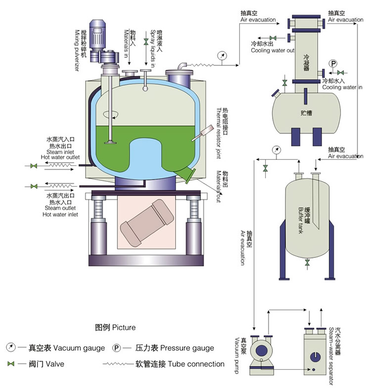本機主要依靠來自容器底部的激振器所產(chǎn)生的機械振力和激振力矩,使容器產(chǎn)生周期性的振動。由于容器底部為一圓環(huán)形狀,各點的振幅不一,使容器內(nèi)的物料即圍繞容器中心軸線公轉,又繞圓環(huán)中心翻滾,合成環(huán)形螺旋運動,從而達到流化狀態(tài)。流化物料與夾套加熱的容器內(nèi)壁接觸傳熱升溫,達到汽化點后在真空下水份汽化外排,致使物料快速脫水干燥。流程圖